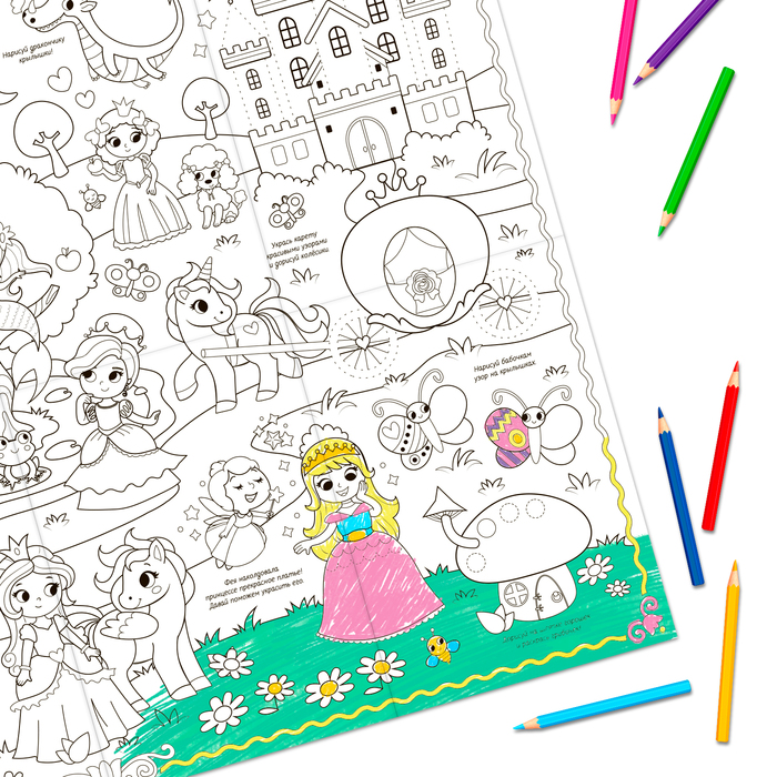 - Плакат большого размера предоставляет обширное поле для раскрашивания, где малышка может экспериментировать с карандашами или акварелью.