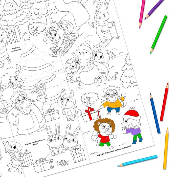 Раскраска-гигант «Новогодняя сказка» — это настоящий простор для детской фантазии! Ведь внутри не просто картинки, а настоящий сюжет. Большой плакат могут раскрашивать несколько ребят одновременно, выполняя весёлые задания.
