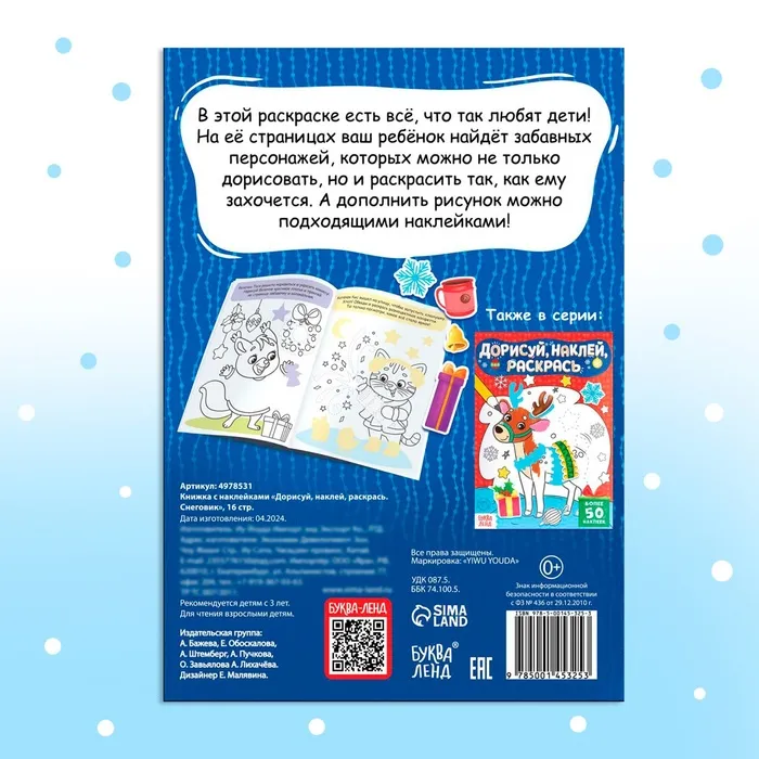 Раскраска - книжка с наклейками «Дорисуй, наклей, раскрась. Снеговик», 16 стр., А5, 60 стикеров — Характеристики