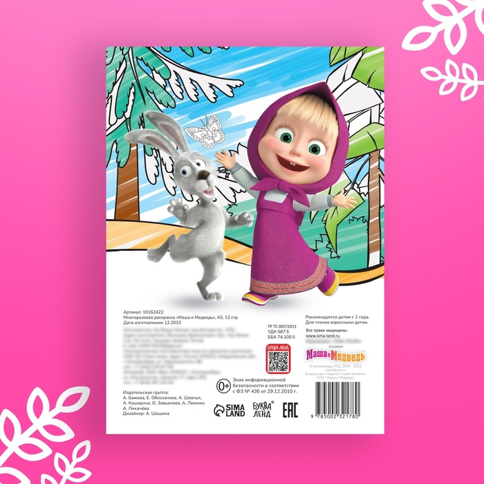 Раскраска многоразовая «Маша и Медведь», А5, 12 стр., 5 маркеров — Характеристики