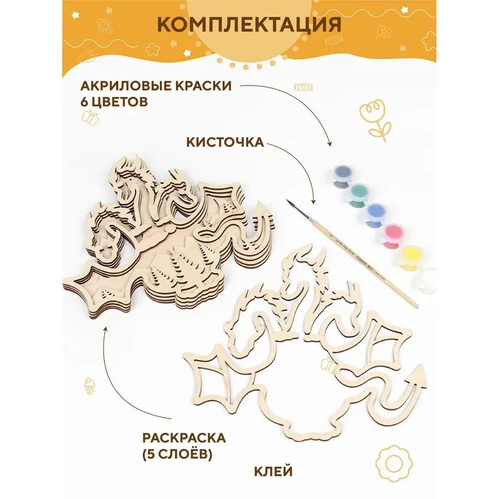 Всё, что нужно для творчества, уже включено в комплект: деревянная основа с несколькими слоями, кисточки, краски и клей. Сначала ребёнок раскрашивает каждый слой, затем собирает их в готовую композицию. Процесс не требует дополнительных материалов и подходит для детей с минимальным опытом рисования.
