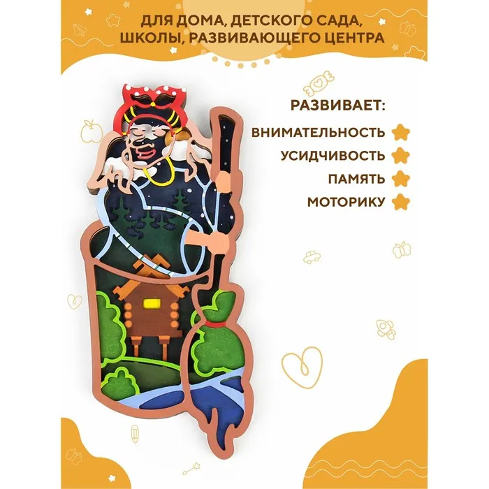 Многослойная деревянная раскраска «Яга» станет прекрасным подарком для детей от 5 лет, увлечённых сказочными историями и творчеством. Это интересный набор для раскрашивания, который помогает развивать фантазию, усидчивость и мелкую моторику. Подходит как для домашних занятий, так и для тематических мастер-классов.