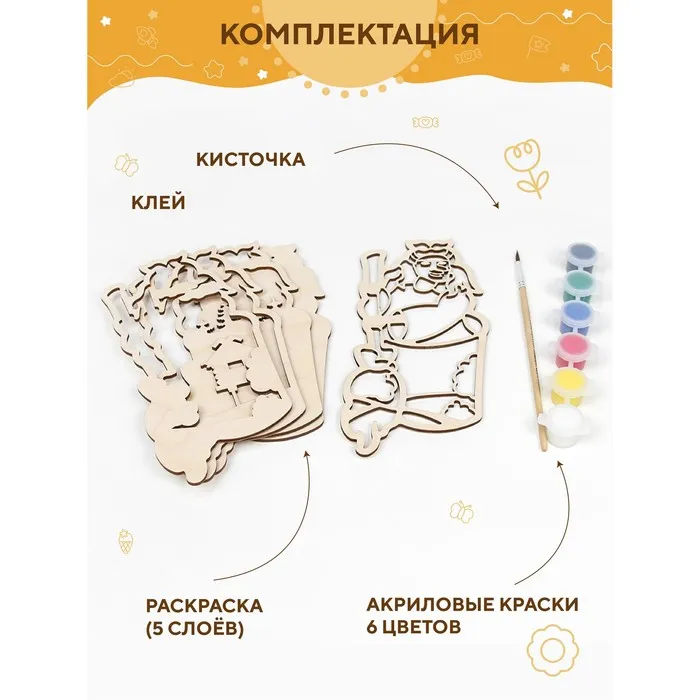 Всё, что нужно для творчества, уже включено в комплект: деревянная основа с несколькими слоями, кисточки, краски и клей. Сначала ребёнок раскрашивает каждый слой, затем собирает их в готовую композицию. Процесс не требует дополнительных материалов и подходит для детей с минимальным опытом рисования.