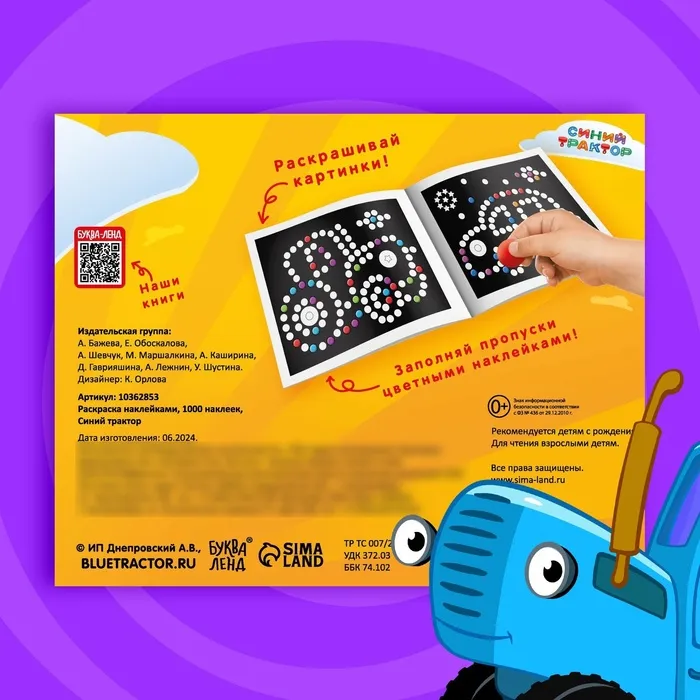 Подарите ребёнку раскраску-наклейки «Синий трактор», чтобы он мог совместить игру и обучение. Это идеальный выбор для детей от 3 лет, которые любят мультфильмы и хотят проявить своё творчество, создавая яркие истории вместе с любимыми героями.