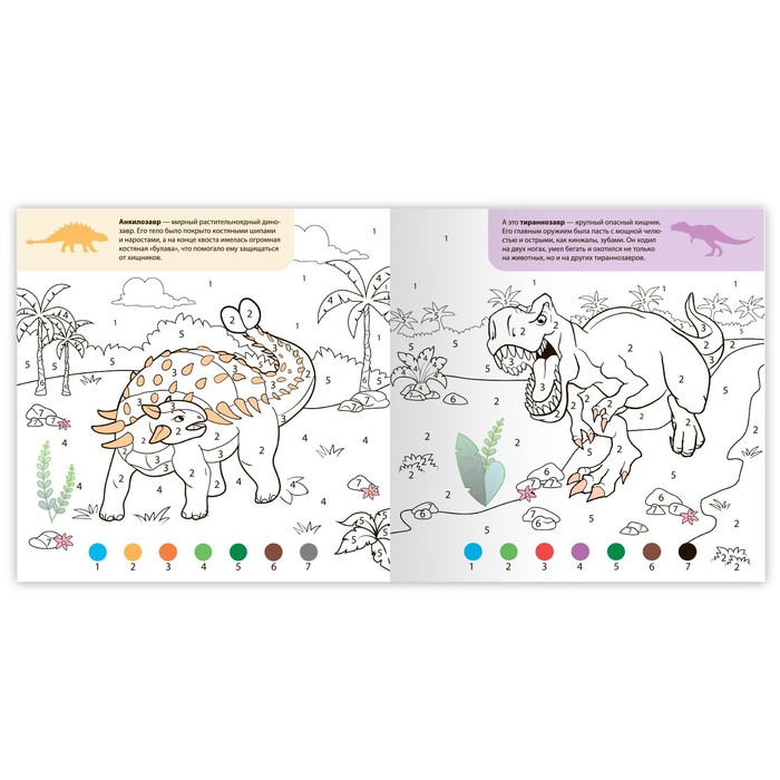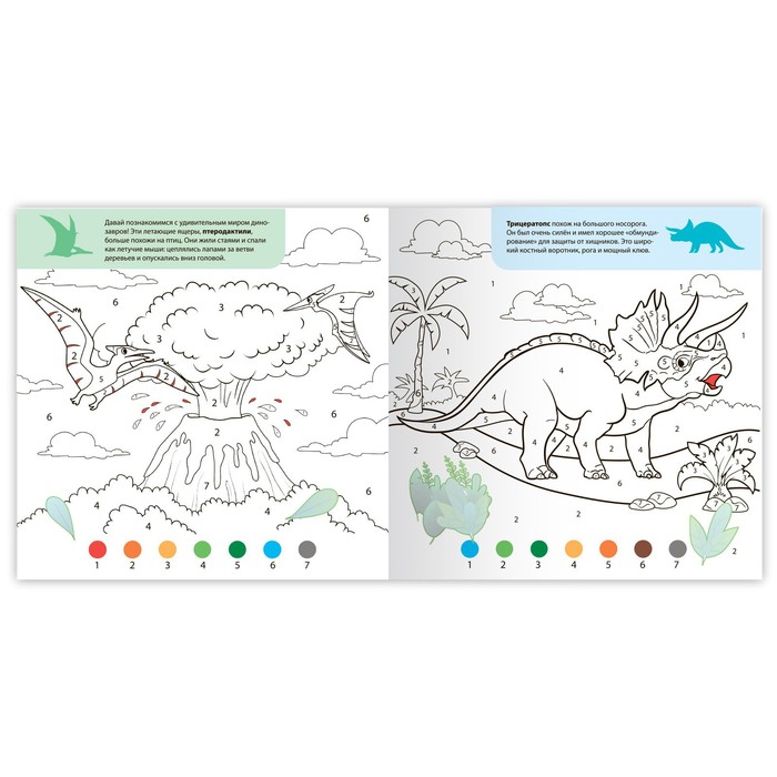 Первое время ребёнку потребуется ваша помощь, но в дальнейшем он справится сам. Нужно лишь объяснить, что каждая область на картинках отмечена цифрами, в соответствии с которыми нужно подобрать цвет, указанный в схеме снизу странички.