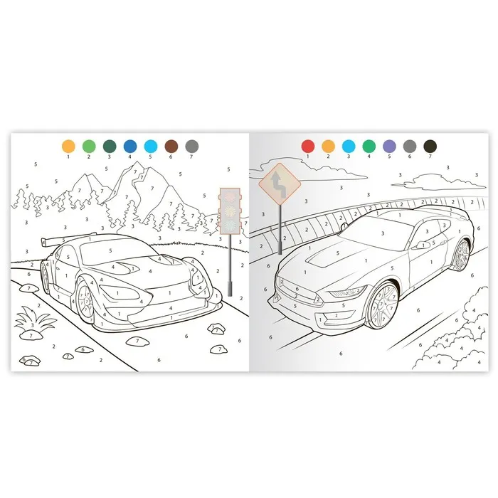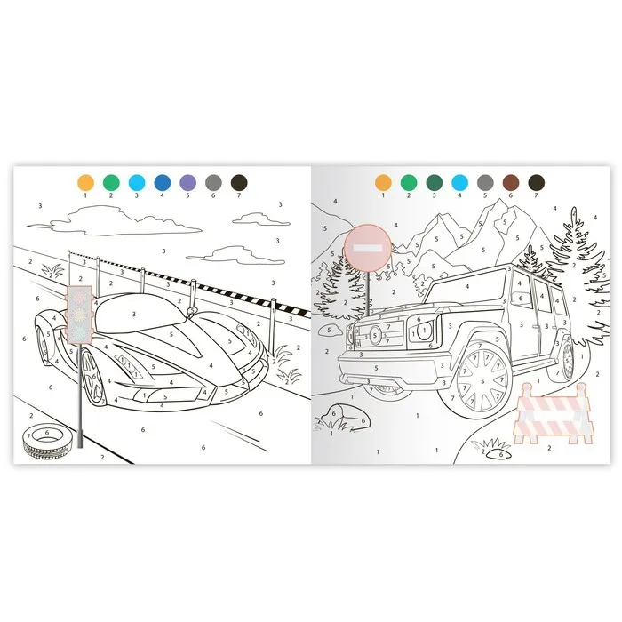 Раскраска по номерам с наклейками — это творческая книга с контурными картинками транспорта. Ребёнок сможет их раскрасить карандашами, красками или фломастерами. Страницы, обложка и наклейки выполнены из бумаги.