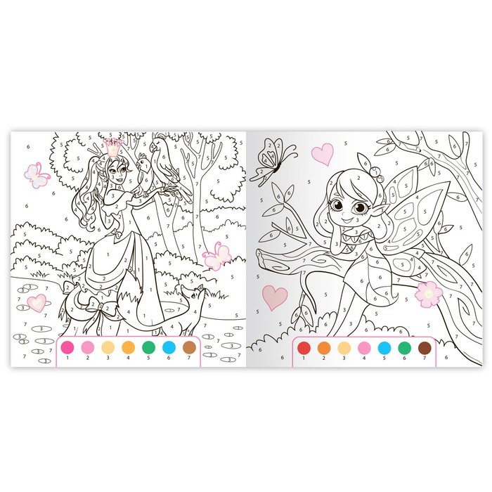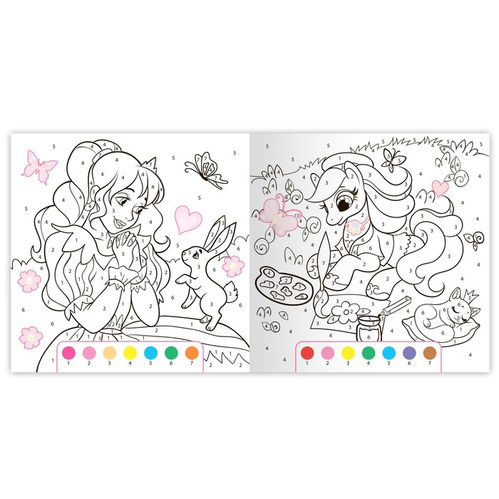 Первое время ребёнку потребуется ваша помощь, но в дальнейшем он справится сам. Нужно лишь объяснить, что каждая область на картинках отмечена цифрами, в соответствии с которыми нужно подобрать цвет, указанный в схеме снизу странички.