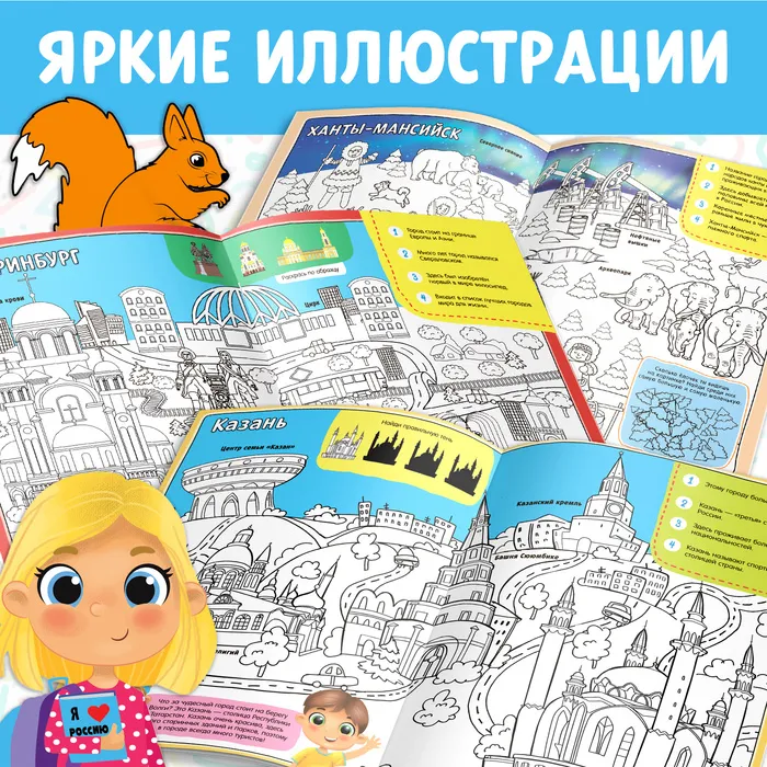 - На 20 страницах ребёнок сможет раскрашивать изображения известных городов и достопримечательностей России, одновременно знакомясь с культурой и историей страны. Это прекрасная возможность расширить кругозор и развить любознательность.