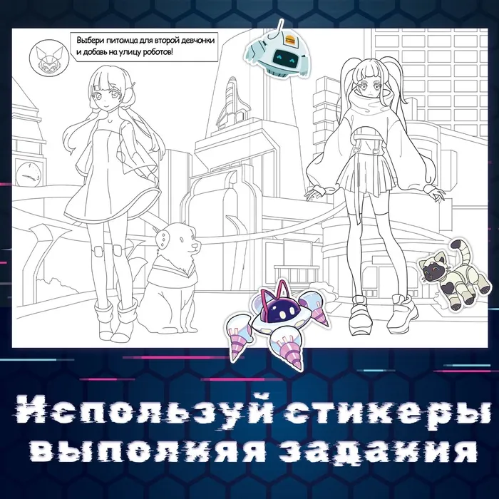 Отправьтесь в удивительный мир будущего, чтобы помочь тяночкам справиться с испытаниями! Раскрашивайте странички и выполняйте задания с помощью наклеек. Вам предстоит чинить роботов, украшать кибер-улицы и строить космические корабли!