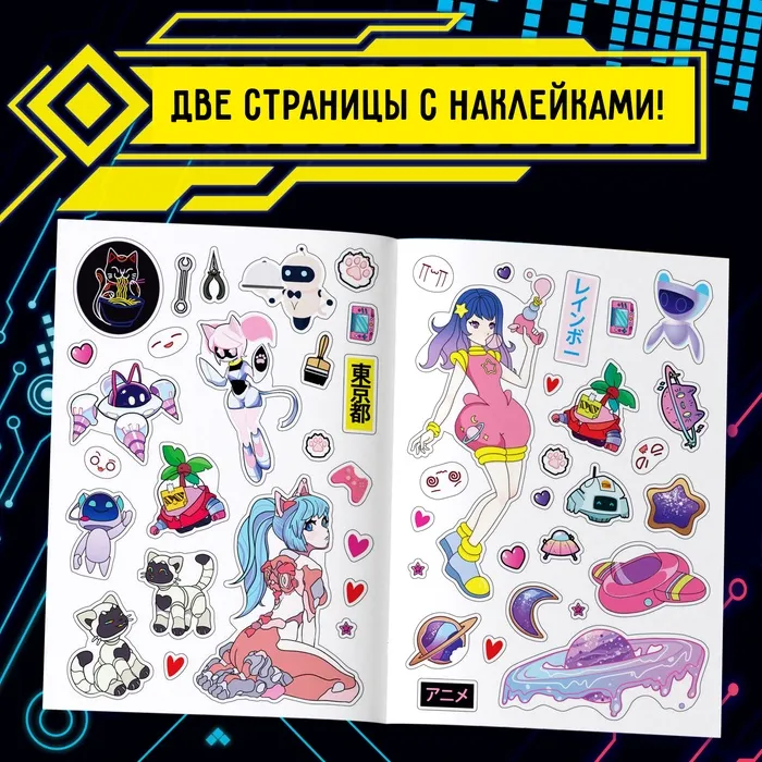 Раскраска с наклейками «Кибер» понравится юным фанатам аниме-культуры. Внутри ребёнка ждут крутые персонажи и наклейки.