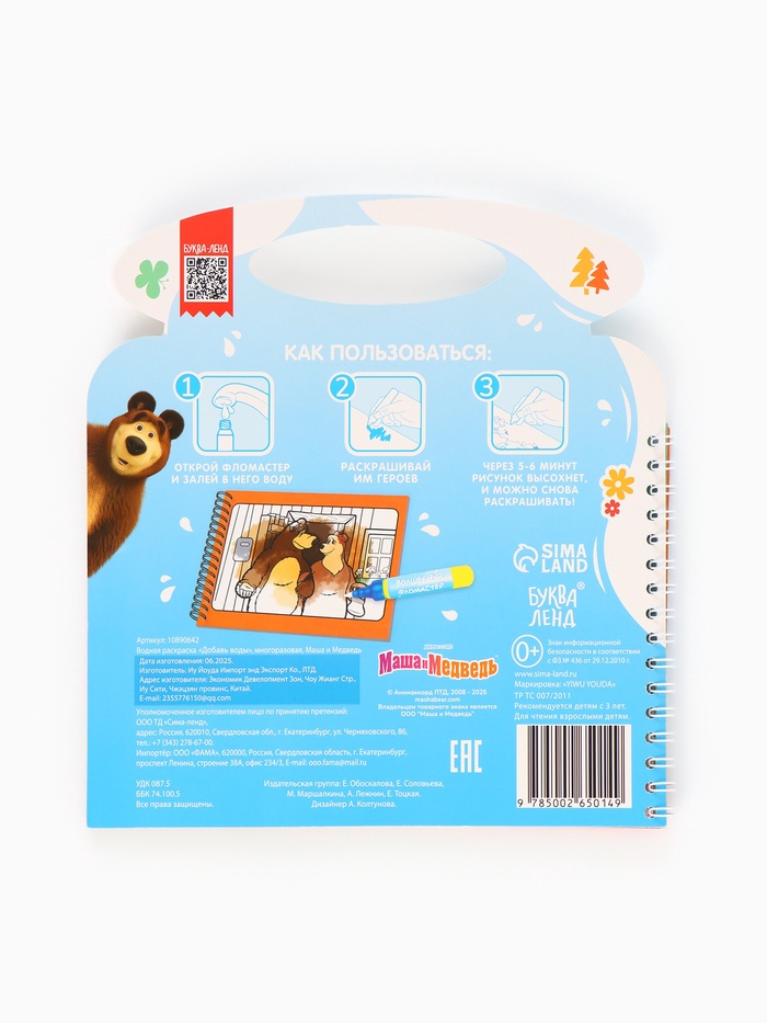 Рисование водой помогает ребёнку развивать мелкую моторику, воображение и внимание к деталям. Каждая страница оживает под воздействием воды, а через несколько минут высыхает, позволяя начать заново. Любимые герои «Маши и Медведя» делают процесс ещё более увлекательным. Это напоминает маленький театр, где каждое движение маркера создаёт новую историю.