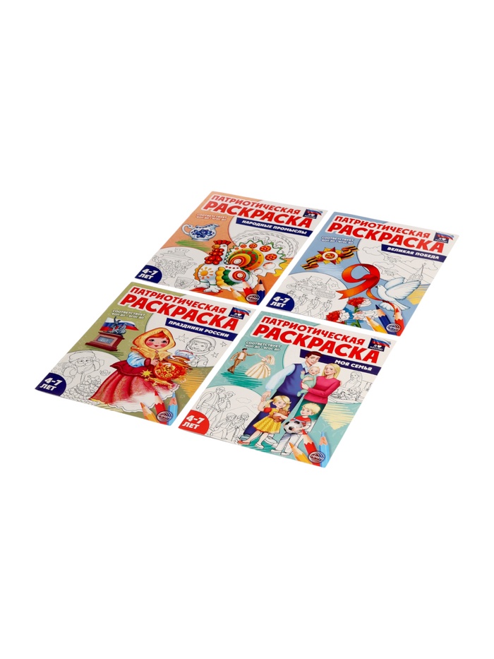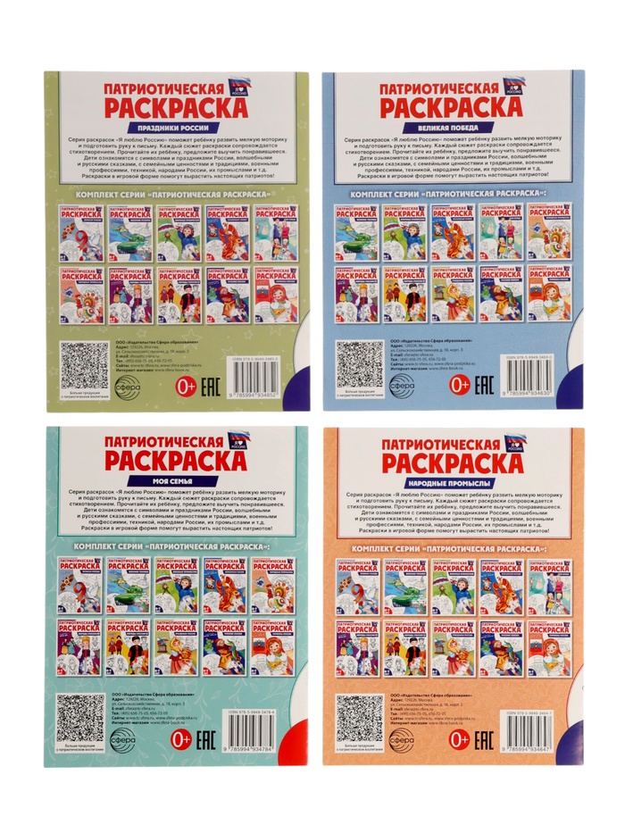 Набор раскрасок «Я люблю Россию» — это четыре книжки с 32 страницами, которые помогают детям знакомиться с символикой страны, её культурой и традициями через творчество. Каждая страница сочетает рисунки и стихи, вдохновляя ребёнка на изучение родной страны.