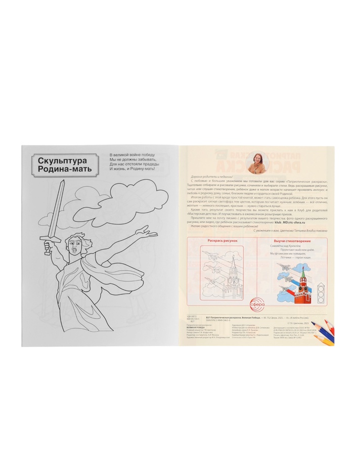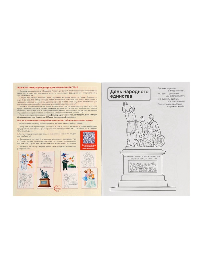 Раскрашивание помогает развивать мелкую моторику и готовить руку к письму. Тематические рисунки знакомят детей с важными аспектами жизни страны: от государственной символики до культурного многообразия. Стихи добавляют образовательный элемент, делая занятия не только творческими, но и познавательными. Благодаря компактному формату, набор удобен для использования дома или в учебных заведениях.