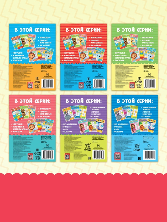 С серией раскрасок для самых маленьких ребёнок познакомится с лесными зверьми, животными Африки, обитателями фермы, а также изучит и разрисует основные виды транспорта.