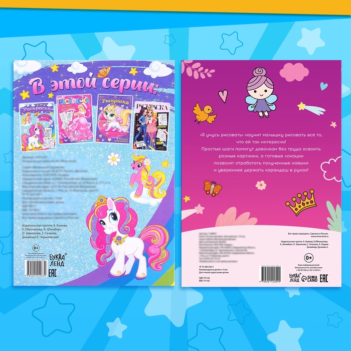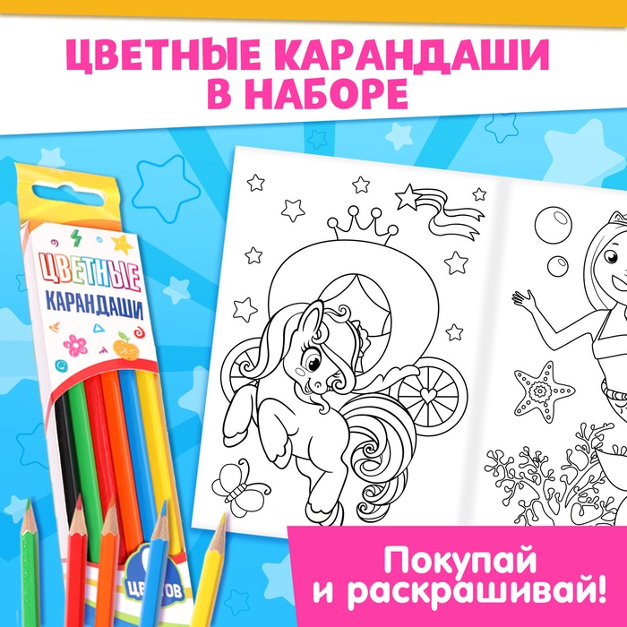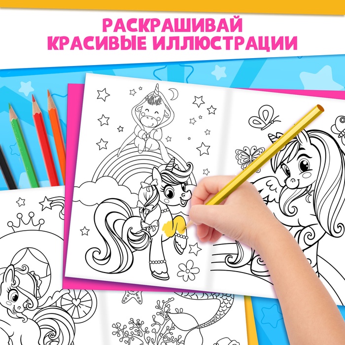 Раскраски для девочек набор «Пони», 2 шт. по 16 стр., карандаши 6 цветов — Характеристики