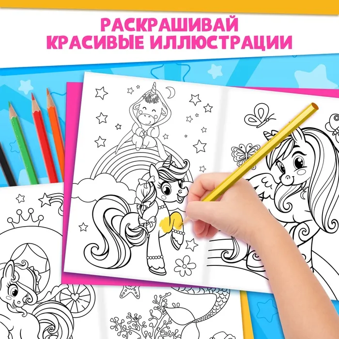 Раскраски для девочек набор «Пони», 2 шт. по 16 стр., карандаши 6 цветов