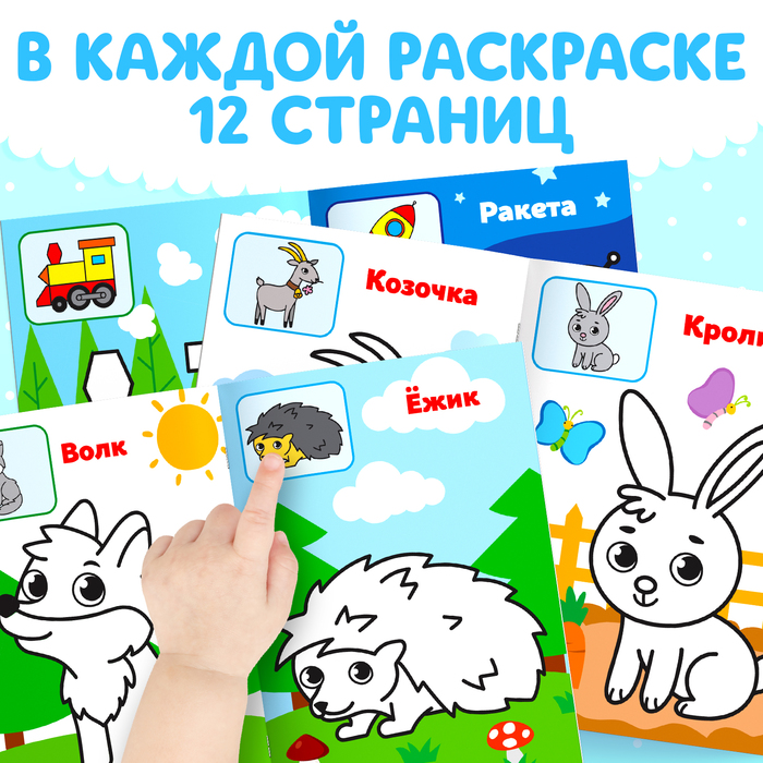 Набор раскрасок станет прекрасным выбором для творчества малышей. Комплект включает несколько книжечек, каждая из которых содержит страницы с увлекательными рисунками. Такие раскраски помогут ребёнку провести время с интересом и пользой.