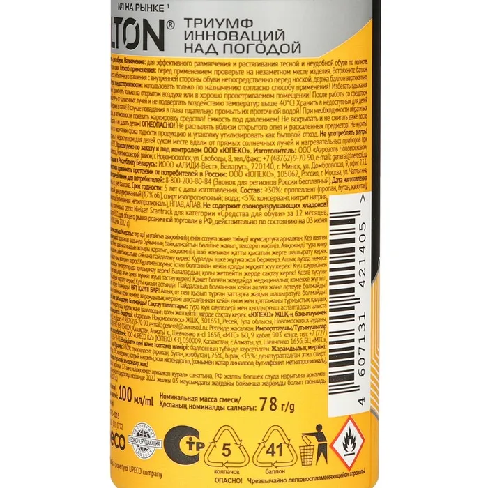 Воздушная пена равномерно распределяется по внутренней поверхности обуви, исключая намокание. Средство соответствует мировым стандартам и подтверждено сертификатом ISO 9001:2008.