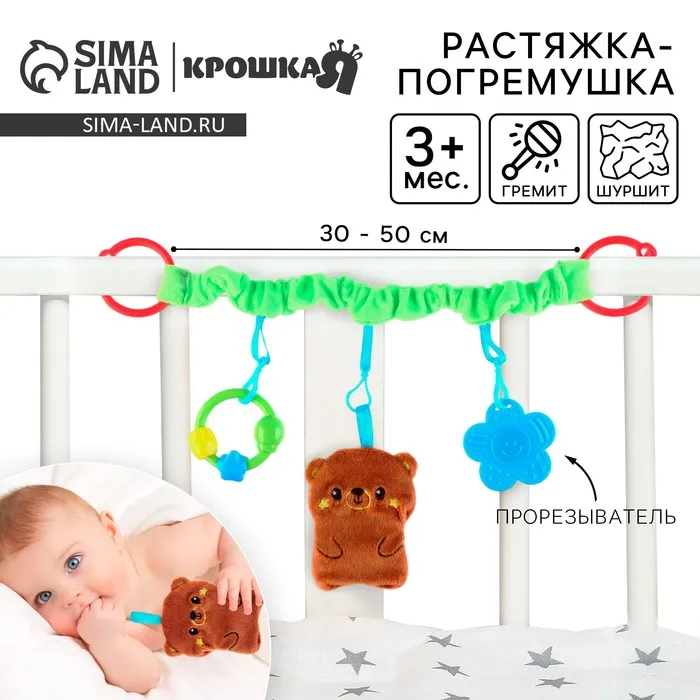 Игрушка-растяжка, которую можно подвесить на бортик детской кроватки, коляску или автокресло. К игрушке прикреплены развивающие элементы.Игрушка-растяжка сделана из безопасных материалов разного цвета и разной фактуры. Игрушка развивает тактильное и визуальное восприятие малыша, а так же служит любимой игрушкой крохи.