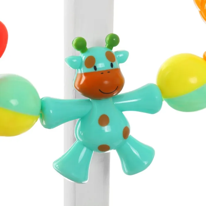 Яркая погремушка-растяжка оснащена удобными креплениями, которые подойдут практически для любого типа коляски, кроватки и даже автокресла.