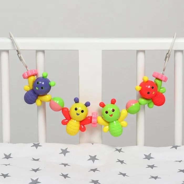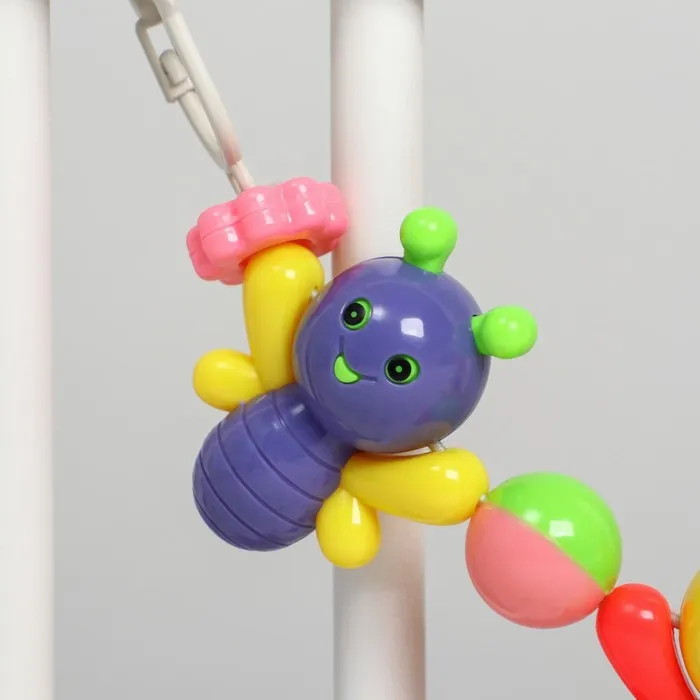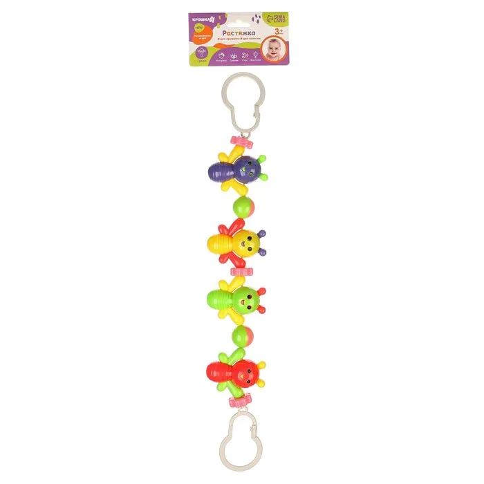 Яркая погремушка-растяжка оснащена удобными креплениями, которые подойдут практически для любого типа коляски, кроватки и даже автокресла.