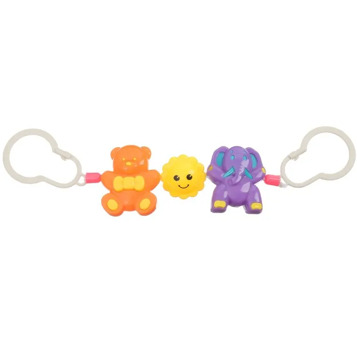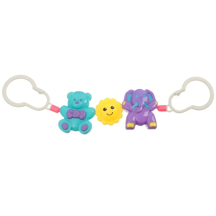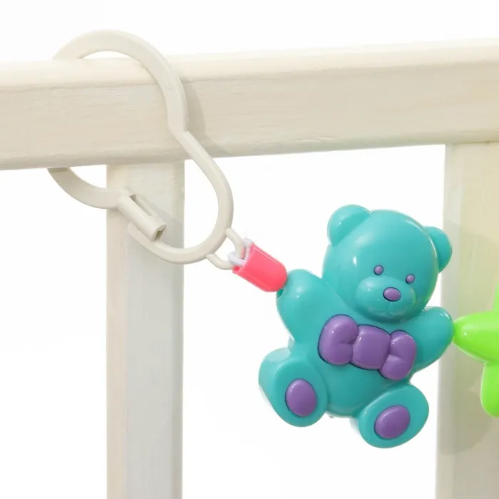 Эту подвеску можно закрепить на детской коляске или кроватке с помощью специальных колечек. Если покачать подвеску, она будет весело греметь. Сначала малыш научится фокусировать взгляд на разноцветных игрушках, а потом начнет тянуться к растяжке ручками и ножками. Такое изделие послужит крохе хорошим тренажером для развития тактильных ощущений, слухового и зрительного восприятия, а также внимания и способности различать цвета. Рекомендованный возраст +3 мес. Изделие изготовлено из пластика.