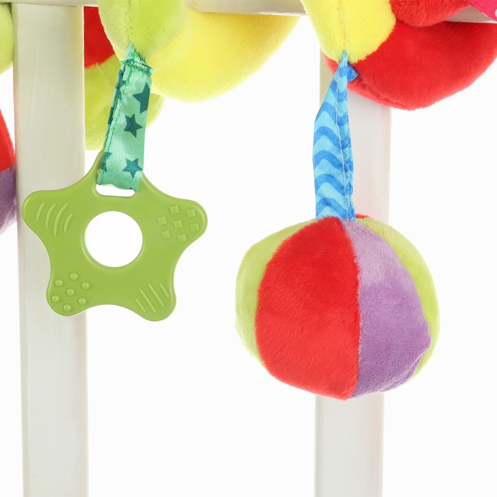Мягкую и гибкую спиралевидную растяжку можно легко обмотать вокруг бортика кроватки, ручки автокресла, бампера коляски, разместить на шезлонг.