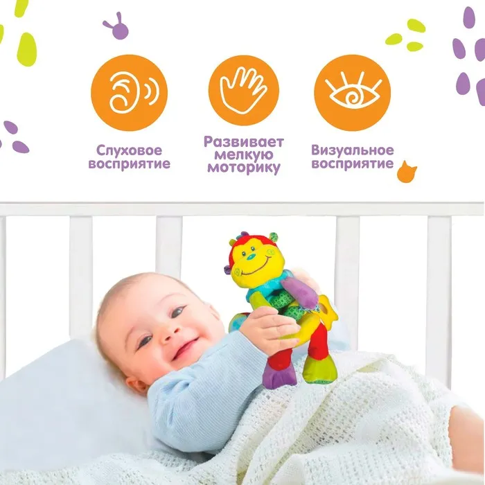Яркие игрушки и звонкая погремушка помогают развить тактильные ощущения,хватательный рефлекс и мелкую моторику.