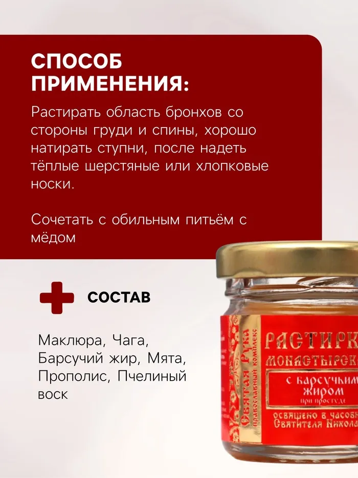 С древних времён известно, что барсучий жир – лучшее средство при простуде. Разогревающий массаж с монастырской растиркой помогает выводить мокроту из лёгких, облегчает дыхание. А растирание стоп позволяет не только пробить носовые пазухи, но и привести в тонус состояние всего организма в целом, нормализуя функционирование всех органов.