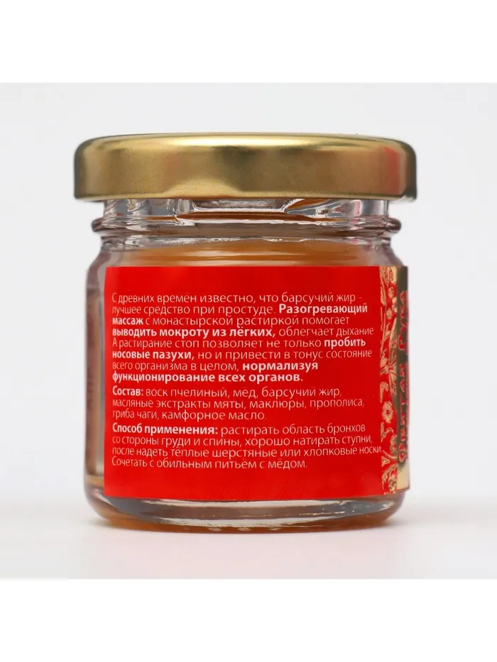 Состав: воск пчелиный, мёд, барсучий жир, масляные экстракты мяты, маклюры, прополиса, гриба чаги, камфорное масло.