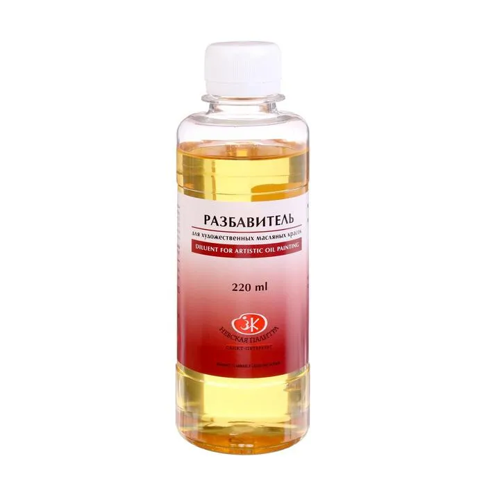 Разбавитель масляный Невская палитра. Применяется для разведение масляных, алкидных красок и для смывания красок с полотен, палитр, кистей. Состав: льняное масло, уайт-спирит, сиккатив.