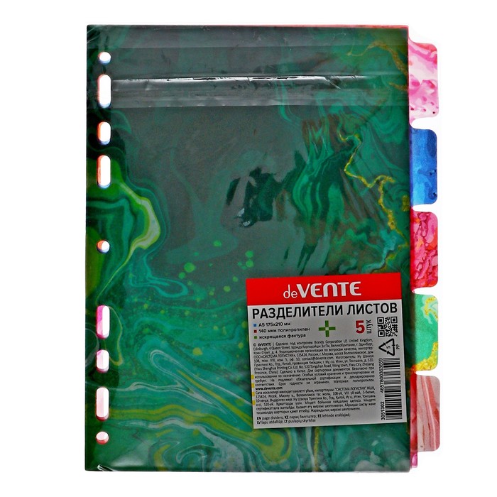 Разделитель листов A5 (175×210 мм) цветовой, 5 листов, "deVENTE. Marandi. Sparkl" полипропилен 140 мкм, искрящаяся фактура, с рисунком, индивидуальная упаковк�... — Характеристики