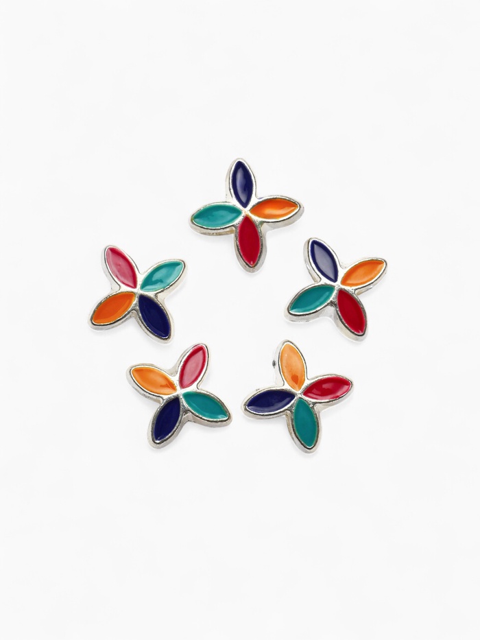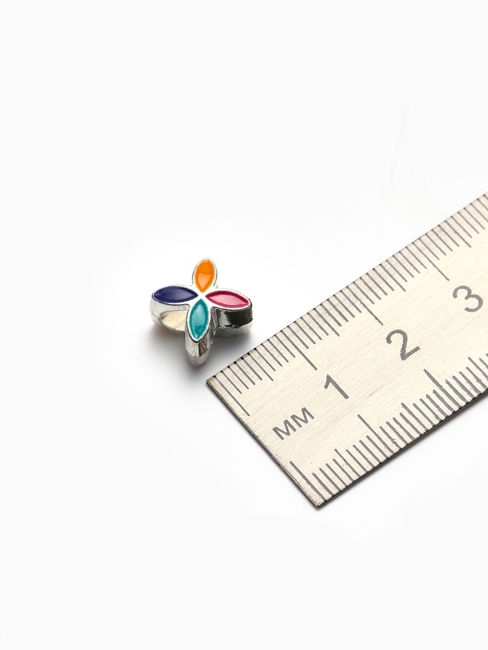Разделитель в форме цветка с яркой разноцветной эмалью на серебряном металлическом основании станет эффектным акцентом в любых украшениях. Его насыщенная палитра оттенков оживляет дизайн, добавляя игривости и свежести, что позволяет создавать уникальные и запоминающиеся композиции.
