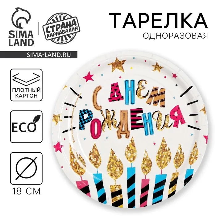 Тарелка одноразовая бумажная "С Днем рождения " свечи и звезды, 18 см