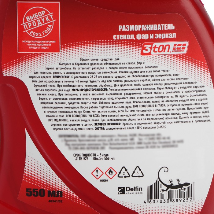 Размораживатель стёкол 3ton ТН-522 550мл – эффективное средство для быстрого и бережного удаления обледенений со стёкол, фар и зеркал автомобиля. Моментально удаляет лёд со стёкол. Не оставляет разводов и следов после высыхания. Безопасен для пластика, резины и лакокрасочного покрытия автомобиля. Рекомендуется для всех типов транспортных средств.
