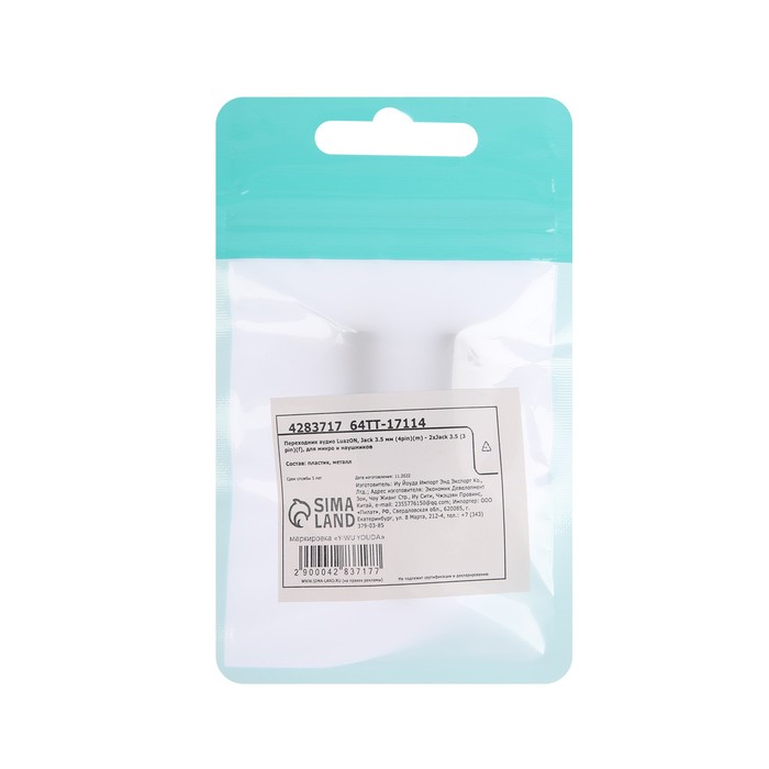 Разветвитель Luazon, Jack 3.5 мм (4pin)(m)-2xJack 3.5 (3 pin)(f), для микро и наушников — Характеристики