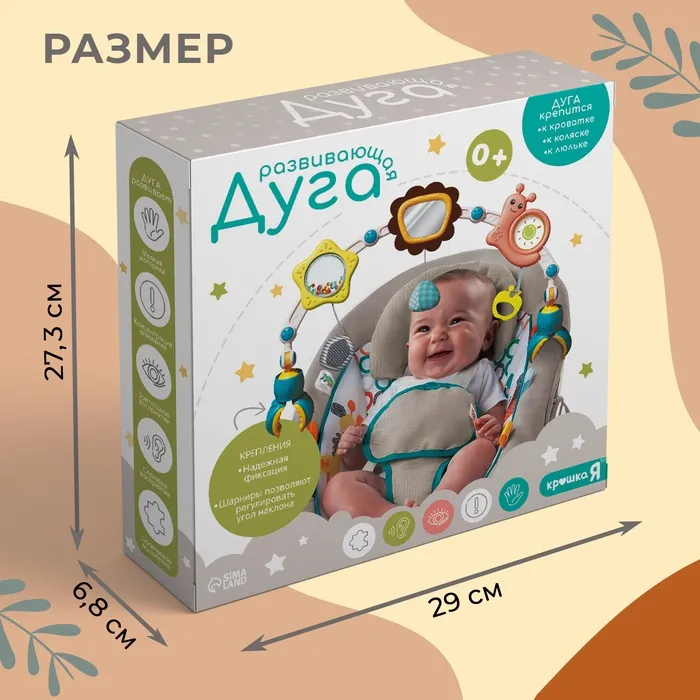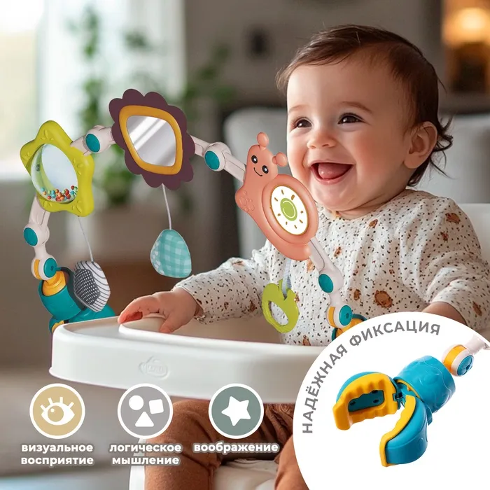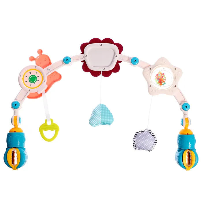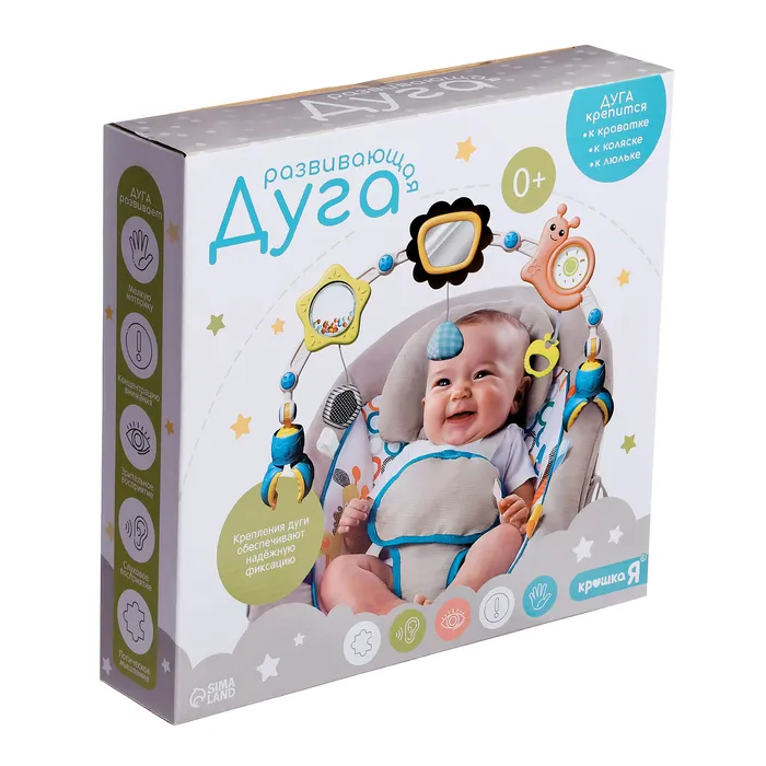 Развивающая дуга помогает научиться фокусировать зрение и задерживать взгляд на объекте. Первая игрушка малыша развлекает его и стимулирует хватательный рефлекс.Дугу можно прикреплять к коляске, кроватке и люльке, чтобы ребёнок не скучал.