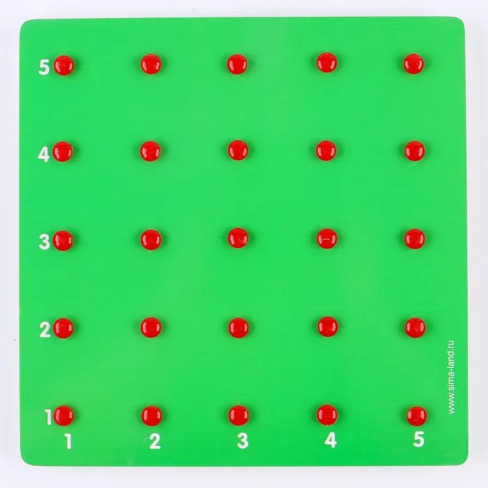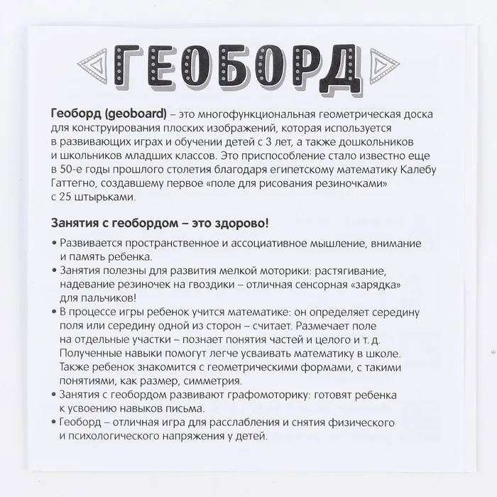 Геоборд — это специальная доска для конструирования различных изображений с помощью равноудалённых друг от друга штырьков и резиночек. Их малышу предстоит нанизывать на выпуклые элементы и создавать таким образом разнообразные фигуры.