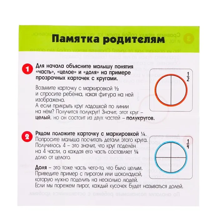 - Малыш будет выполнять задания и делить предметы на части. Так он с лёгкостью запомнит, как выглядят и чем отличаются друг от друга разные дроби.