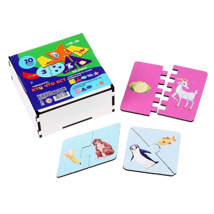 В набор входят 20 двусторонних деталей. С одной стороны изображены животные и пища, с другой - цифры и картинки.