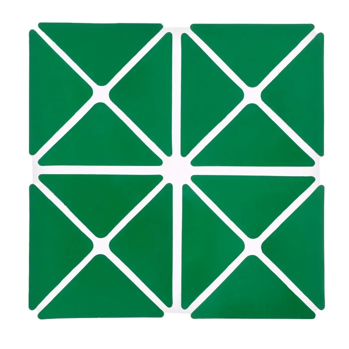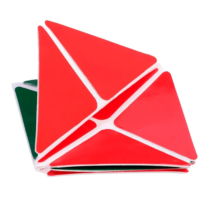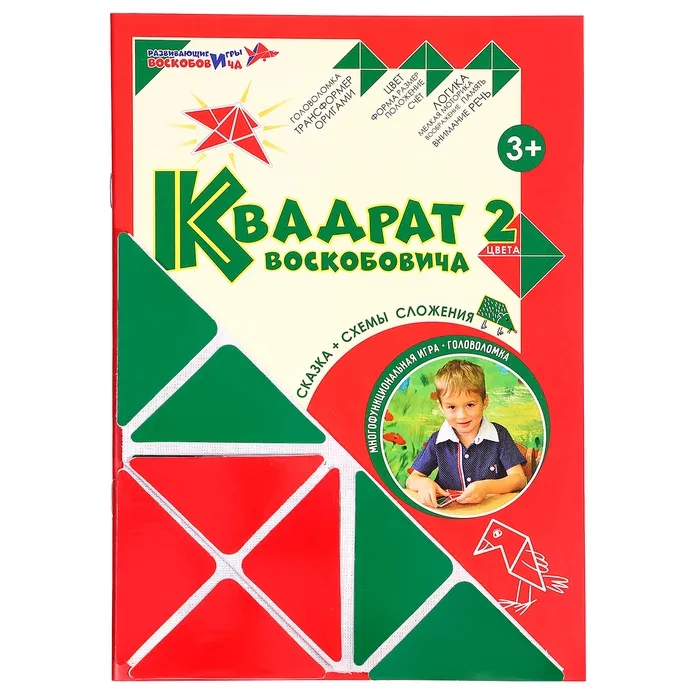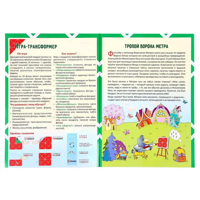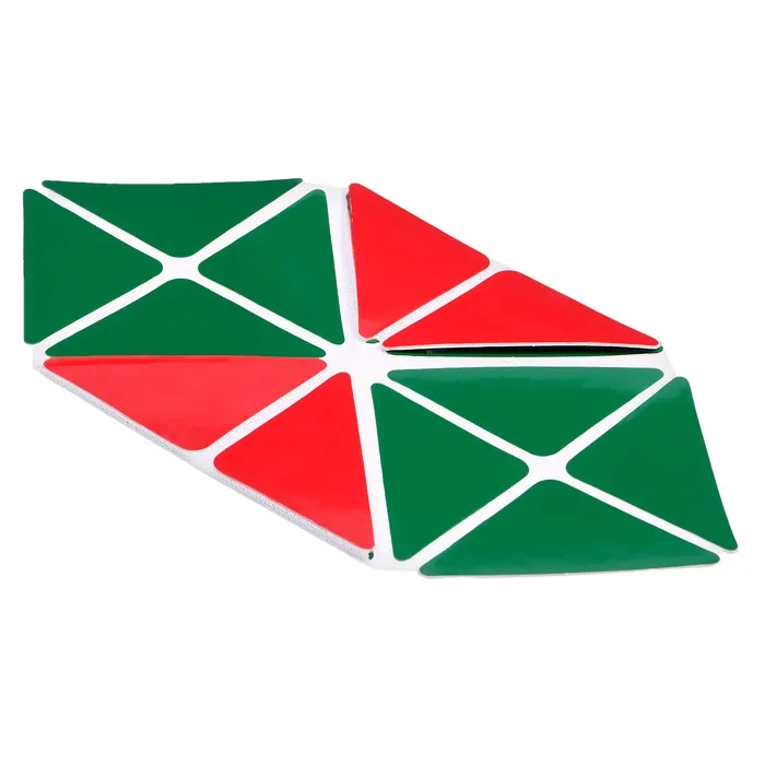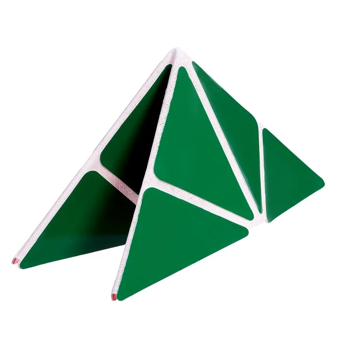 Развивающая игра представляет собой квадратное поле, включающее 16 равнобедренных треугольников размером 4,5 × 4,5 × 6 см. Они наклеены на гибкую тканевую основу на расстоянии 3–5 мм друг от друга. С одной стороны детали красного цвета, с другой — зелёного. Складывайте элементы по линиям сгиба в разных направлениях, составляйте геометрические и предметные фигуры по схеме в альбоме или придумывайте собственные. Научите ребёнка объёмному конструированию. Делайте у деталей разрезы в определённых местах, указанных в приложении, и создавайте пространственные фигуры. Этот дидактический материал знакомит детей с основами геометрии, стереометрии, моделирования и счётом.