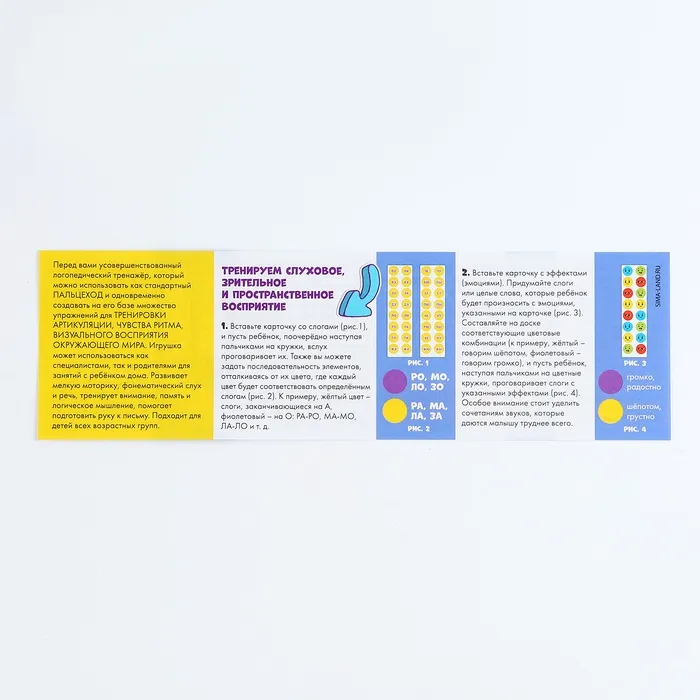 Перед вами усовершенствованный Логопедический тренажер, который можно использовать как стандартный пальцеход и одновременно создавать на его базе множество упражнений. Игрушка может использоваться как специалистами, так и родителями для занятий с ребёнком дома.