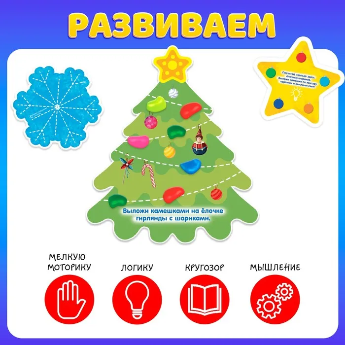 С этими камушками ребёнок будет создавать сказочные картинки. Можно сделать ёлочку, снежинки, звёздочки, новогодние игрушки или придумать свои сюжеты.