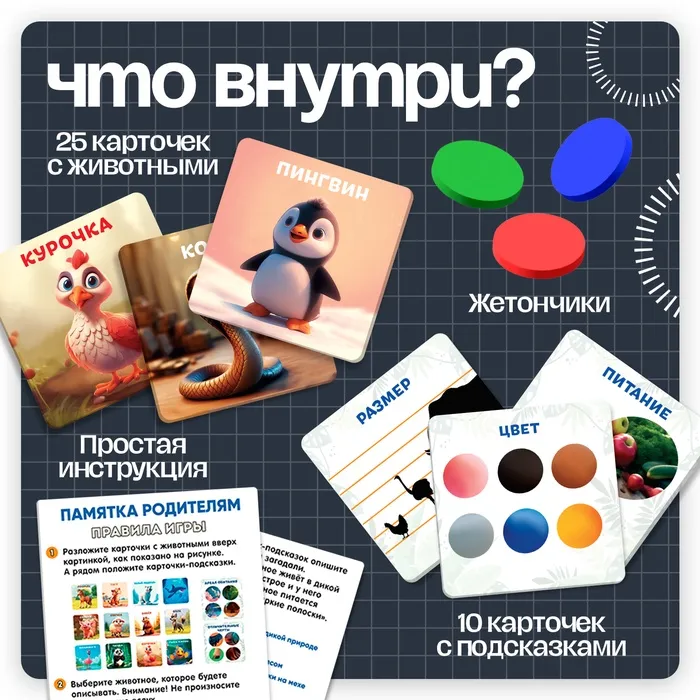 Настольная игра «Отгадай кто?» поможет детям весело расширить кругозор, развить логику и воображение. Участникам предстоит угадывать животных по описанию, зарабатывая жетоны за правильные ответы. Отличный вариант для семейных вечеров и детских мероприятий!