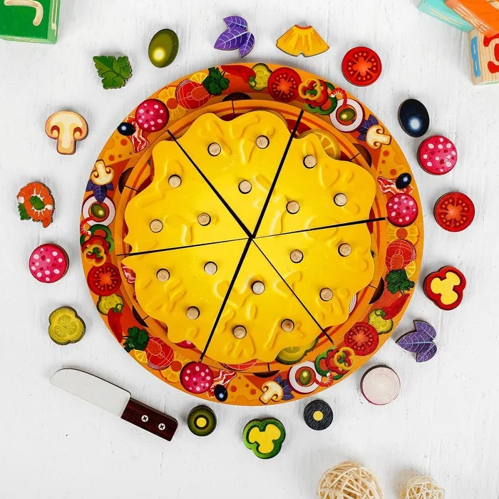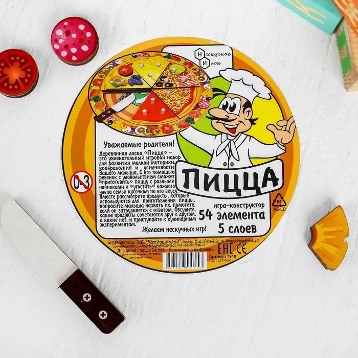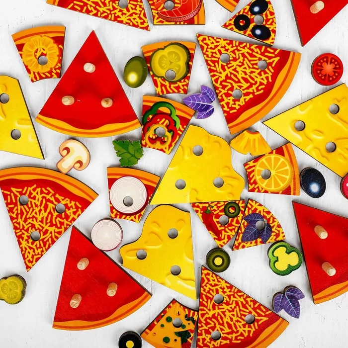 В набор входит 54 элемента, с помощью которых можно сложить пиццу из 5 слоёв. Все детали сделаны из прочного и экологичного материала — дерева.