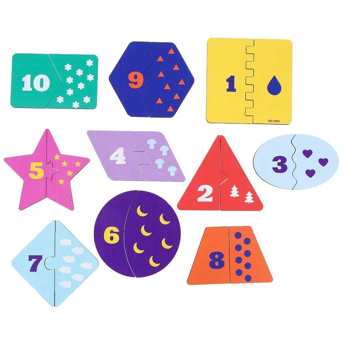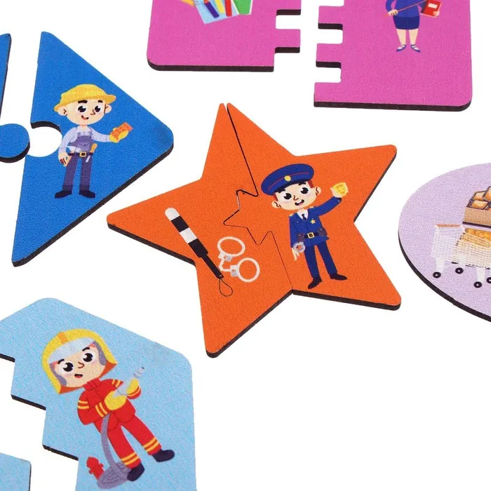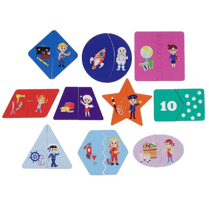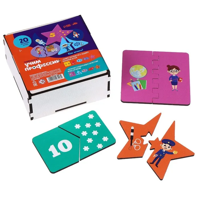 - В наборе представлены 20 двухсторонних деталей: на одной стороне число и соответствующее количество объектов. На другой — изображение атрибутов и героев различных профессий.