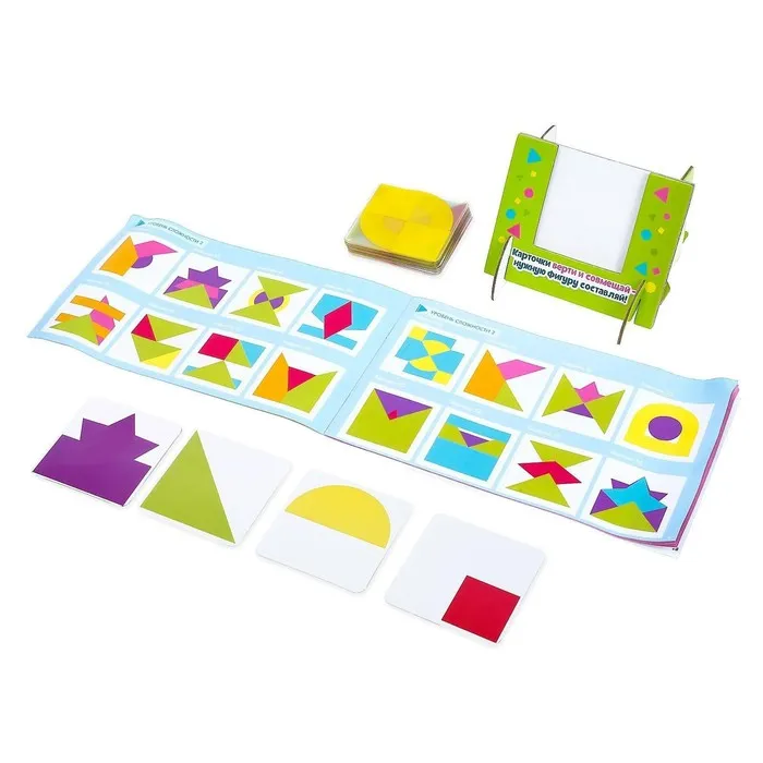 «Умные фигуры» — развивающая игра для детей от 3 лет. Ребёнка ждут 100 интеллектуальных заданий и яркие пластиковые карточки. Рассматривайте с ребёнком цветные фигурки на карточках, вертите и совмещайте их, получая новые комбинации.