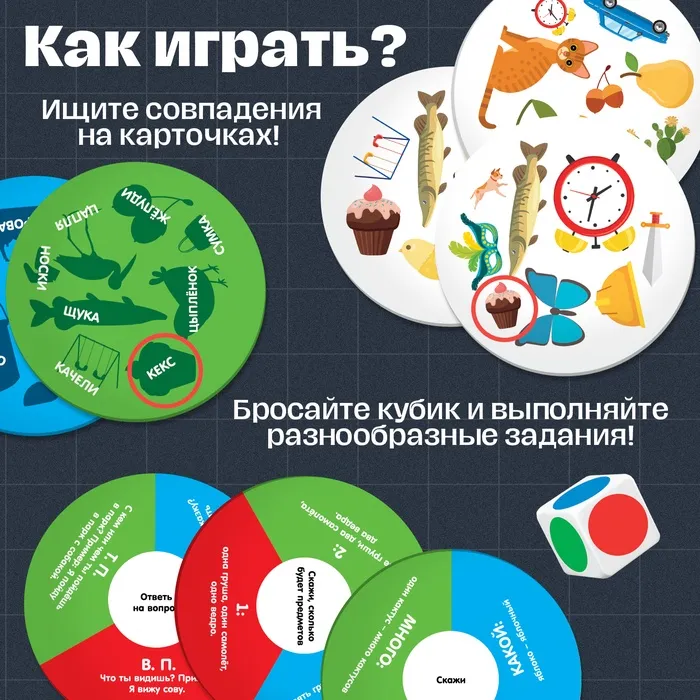 Внутри вы найдёте 70 карточек с разными животными и предметами, кубик и памятку для родителей.