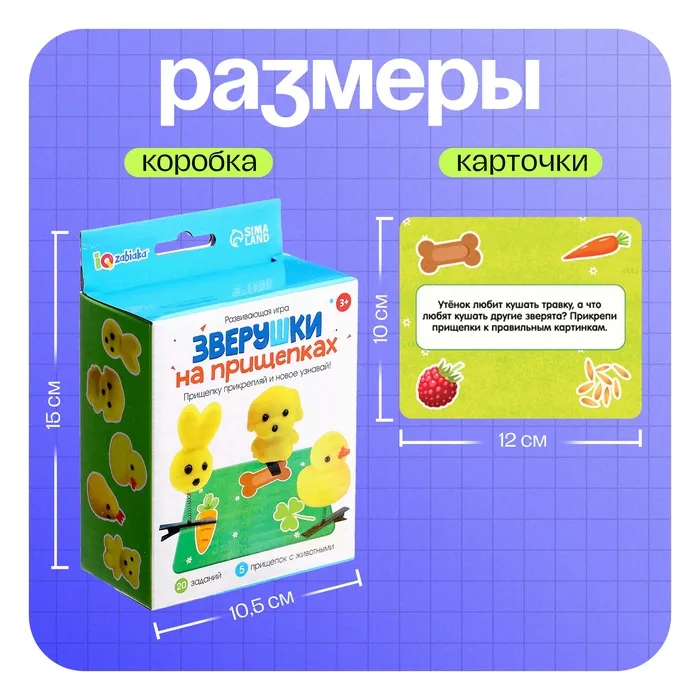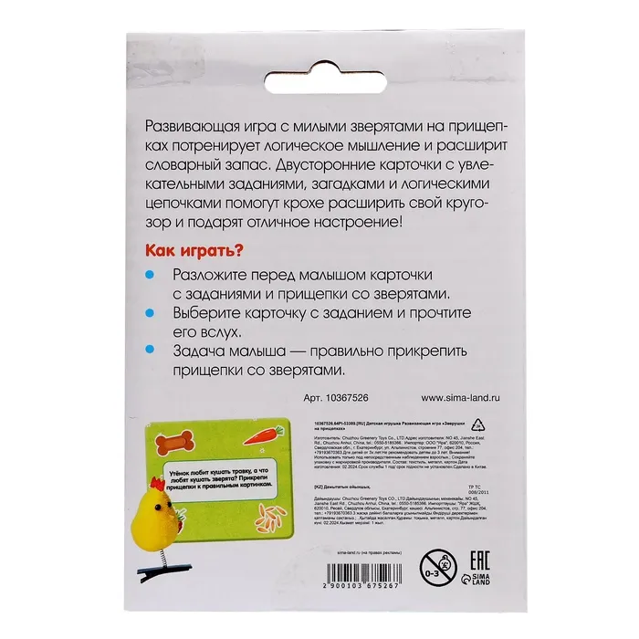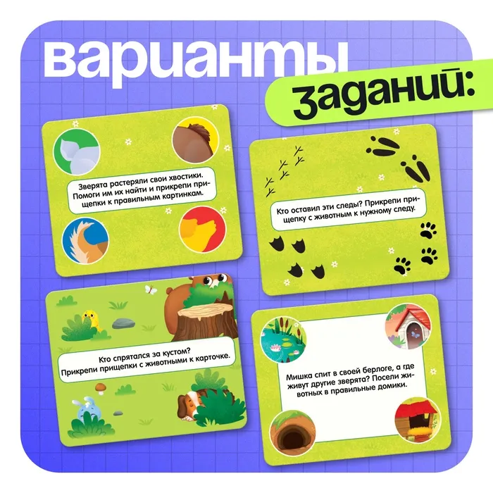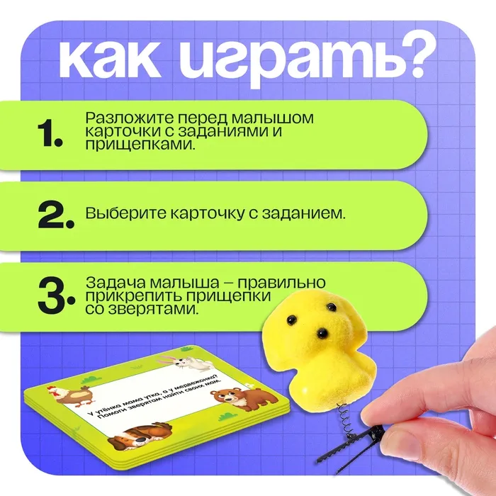 Развивающая игра «Зверушки на прищепках» — отличный способ для ребёнка весело провести время, развивая важные навыки. 20 увлекательных заданий помогут малышам потренировать логику, внимание и мелкую моторику, а милые фигурки животных превратят обучение в игру.