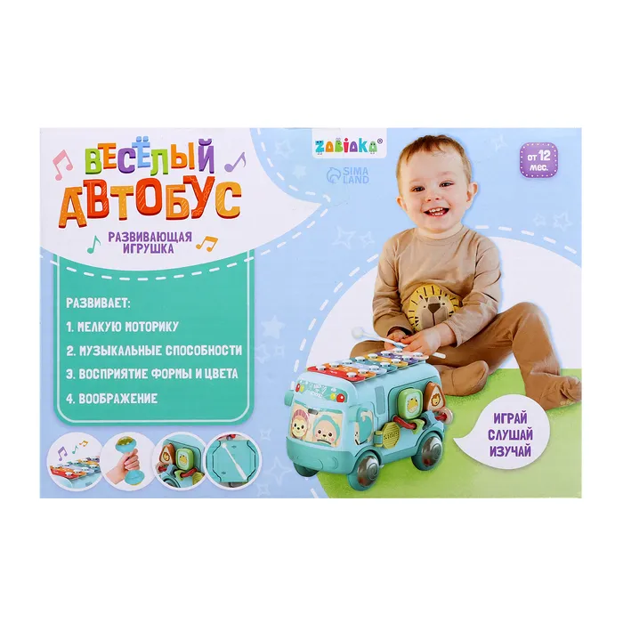 - Автобус объединяет три популярных игровых формата. Ребёнок может сортировать фигурки-вкладыши, играть на металлофоне или трясти колёсами-погремушками.